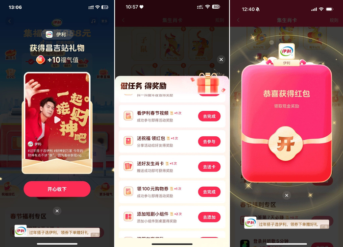 伊利作为冠名商,通过在“欢笑中国年”每个活动中的巧妙植入和互动设计,强化了品牌在春节场景中的陪伴属性,让“过年搭子选伊利”的心智深入人心。拿集福气活动来说,品牌针对用户在春节期间的多元需求送上不同内容的定制化福气,包括和代言人一起接财神、新年必备祝福语等,创造了具有情感价值的品牌体验,成功赢得用户好感。不仅如此,伊利还通过设置品牌任务,吸引用户观看品牌视频或参与品牌挑战赛,进而引流到直播间和店铺,直接拉动销售转化,实现了品效双赢。