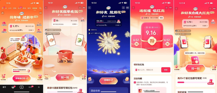 本次“欢笑中国年”活动,在抖音、抖音火山版、抖音极速版、西瓜视频同步上线。活动中的各项玩法均设有任务导流机制,用户只需按照提示到各个平台完成任务,即可获得奖励。