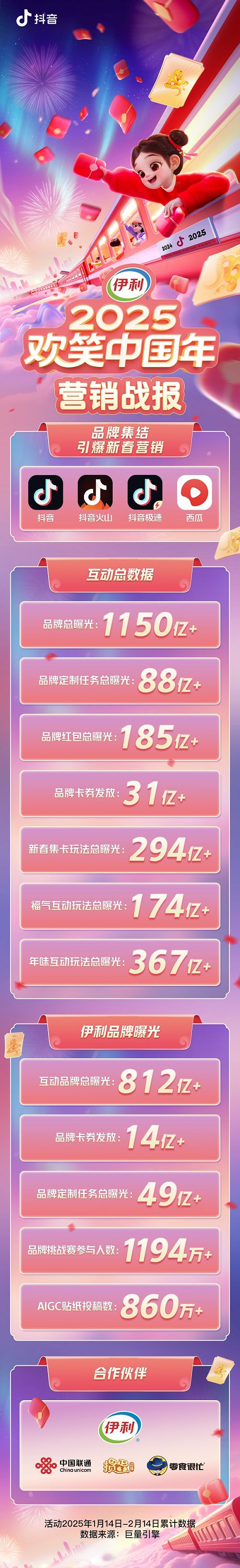 活动期间,伊利互动品牌总曝光超过812亿、品牌卡券发放超14亿、品牌定制任务总曝光达49亿、品牌挑战赛参与人数超过1194万人、AIGC贴纸投稿数超过860万,进一步深化了与用户的情感链接,巩固了国民级品牌的形象。