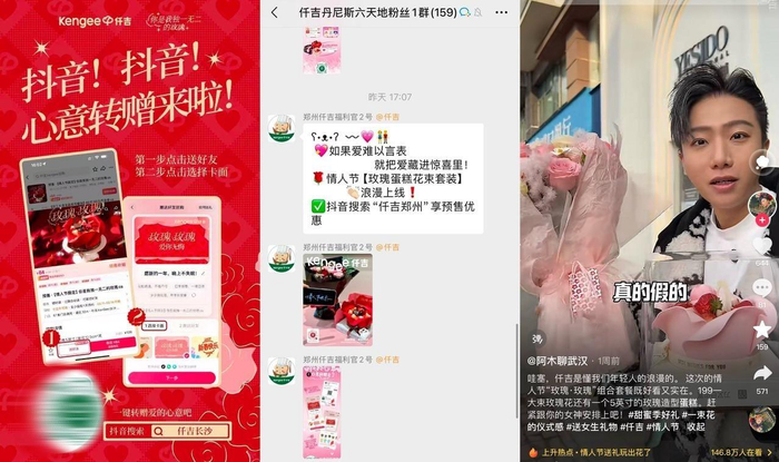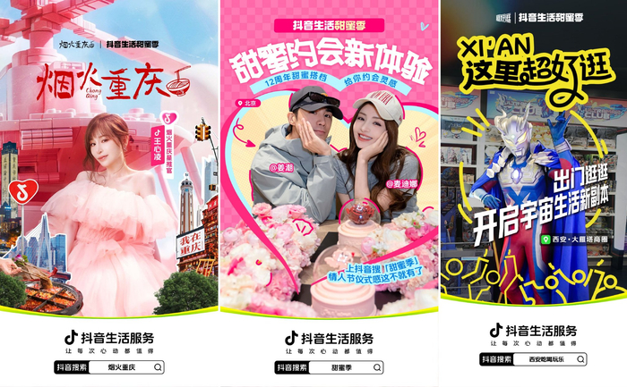 不止线上下单、一键转赠的新型“送体验”方式,「抖音生活甜蜜季」还推出明星助阵、跨界联名、地标大屏打卡多重玩法,为过节送礼开辟线下新体验。南区牵手“甜心教主”王心凌,通过Vlog分享慕叁山甜品,并在演唱会期间现身重庆大融汇,派发同款甜蜜。中区不仅联动“爱是保护你的英雄搭子”奥特曼,提供满满安全感,更邀约破破烂烂的烤肉店品牌创始人直播“价到”,给大家饱饱的幸福感。北区邀约姜潮、麦迪娜夫妇上演情人节微电影,联合多个商家为情侣们全景打造“约会小宇宙”。