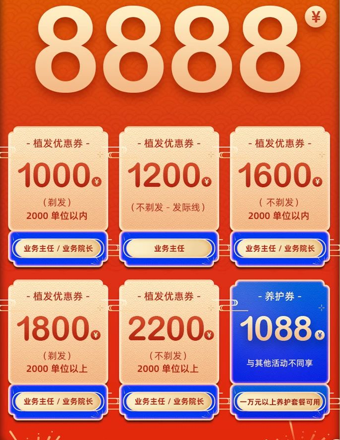 据了解,在2025年2月12日到3月16日期间,雍禾植发在全网发放2.2亿代金券,人均可领8888元生发红包,总计发放24753份。消费者凭代金券到雍禾植发线下院部进行植发或养护项目时,即可享受1000元至2000元的优惠。