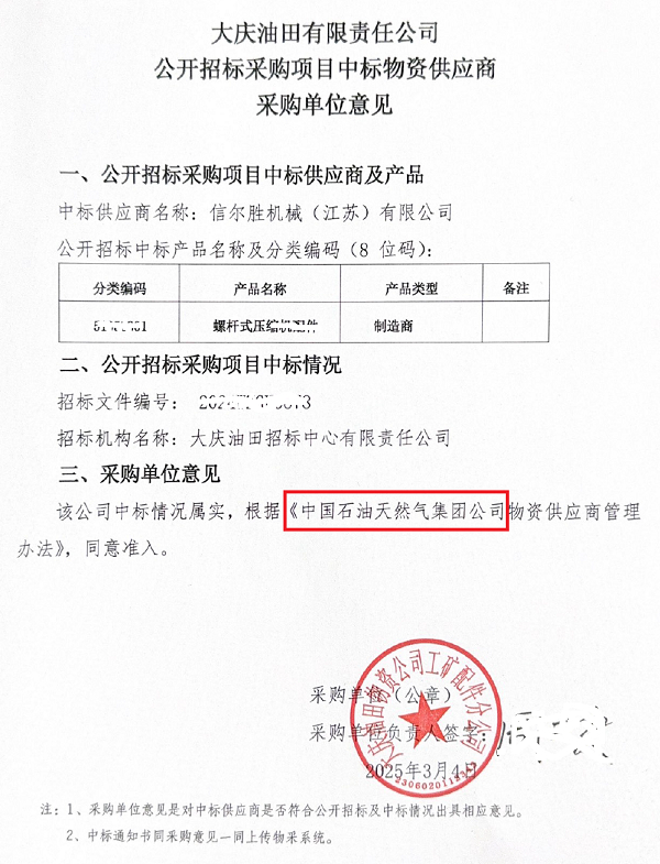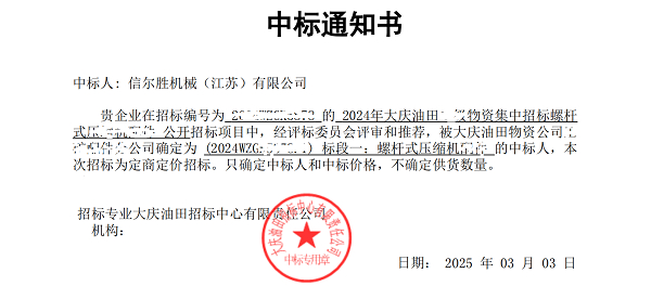 2025年3月6日,上海信然压缩机江苏工厂-信尔胜机械(江苏)有限公司收到中国石油天然气集团大庆油田【中标通知书】,信然集团作为空压机、真空泵、鼓风机、氢能源设备赛道的隐形冠军,解码信然中标总金额大于3200万(叁仟贰佰万)中石油订单长周期竞争力!信然压缩机制胜法宝:对标国际空压机巨头、从制造到“智造”、破局外资技术服务垄断,解决卡脖子问题,实现国产替代和超越。