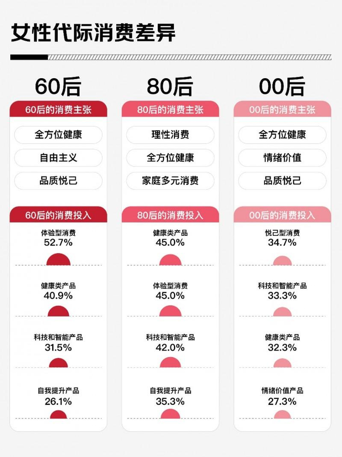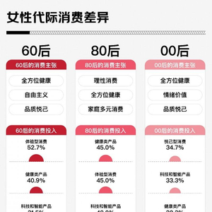 不同代际群体的消费主张与产品偏好呈现出显著差异。从00后的情绪悦己、80后的家庭理性到60后的品质自由,女性消费市场正在形成多维度、分层次的消费图谱。