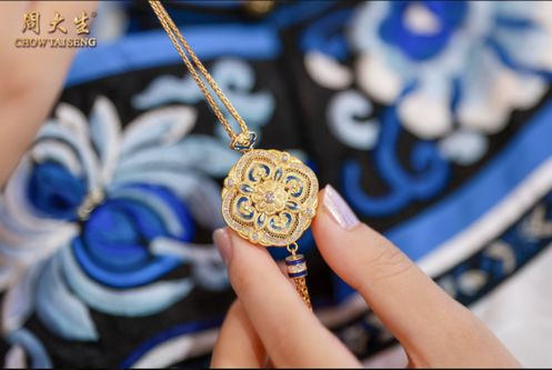 青花釉彩珐琅工艺的运用,是青花艺术历史与现代交融的结晶,不仅让黄金饰品焕发出独特的艺术魅力,更是承载着吉祥寓意,诉说着岁月的悠长故事。比如福禄绵绵项链就提取了青花瓷中常见的缠枝花纹、蝴蝶纹,传递着福运连绵的美好祝愿;青花莲韵项链则是提取了卷草纹样,寓意着欣欣向荣的积极状态;吉庆团花手镯以四瓣如意海棠纹装点,寓意着诸事顺遂、圆满如意,精致细腻,为珠宝增添了一抹灵动与生机。