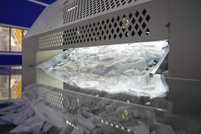 自动生产线剔除的残次品则直接送入工厂的废料间,在工作人员称重后记录后,送入自动破碎设备进行物理破碎。完全破碎的卫生巾残次品,经工作人员复核无误后进行压包处理,最后转运至专业机构进行环保焚烧销毁,杜绝其被非法回收利用的可能性。