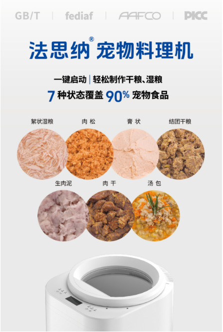 法思纳宠物料理机搭载的宠物营养模块,可精准执行AI方案中的营养参数,采用低温慢煮技术保留食材营养。