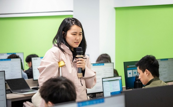 但如果仅仅是站在讲台上,夏老师对讲课效果仍不满意。因为夏老师任教的都是大数据技术相关的课程,很多都在机房上课,学生们的身影常被电脑屏幕遮挡。“隔着这么多电脑屏幕,不能看到同学们的表情,还是担心有同学没听懂。”于是她强忍着身体的不适,一讲解完关键知识点,就拄着拐杖,主动走近电脑屏幕后的同学们,仔细观察学生的实验操作、耐心解答学生们的疑惑。