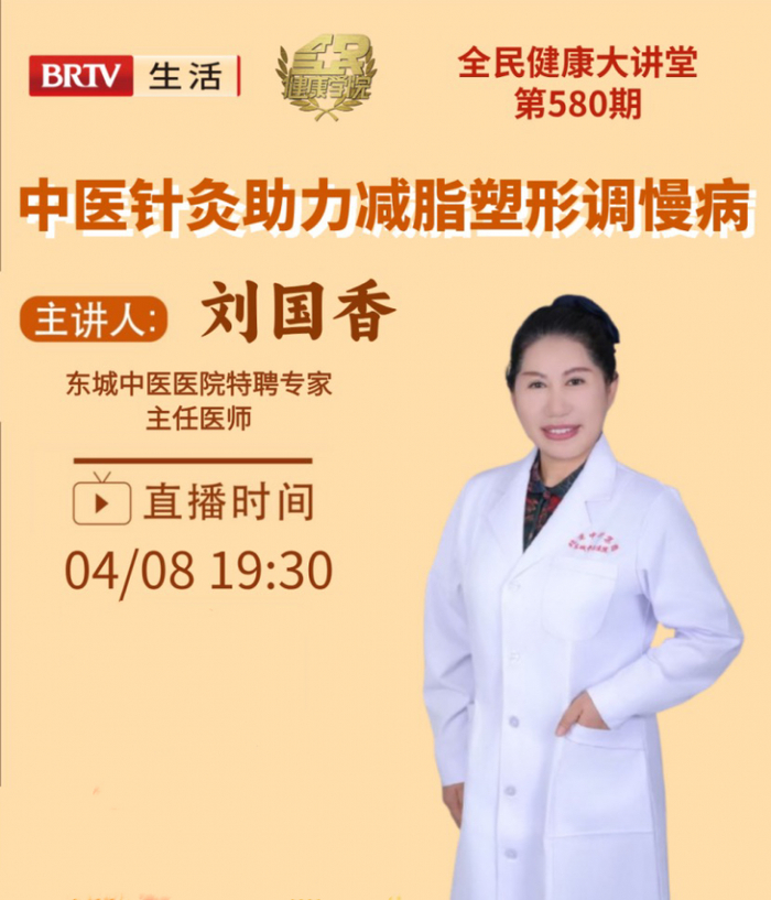 针对不同原因,不同位置的肥胖问题,4月8月19:45,东城中医医院针灸科特聘专家刘国香做客北京广播电视台生活频道《全民健康学院》,帮您解决肥胖问题。