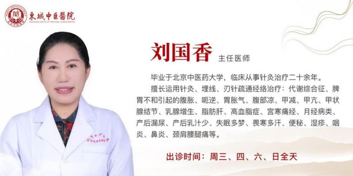 刘国香,主任医师,东城中医医院针灸科特聘专家,出诊时间:周三、四、六、日全天。毕业于北京中医药大学,临床从事针灸治疗二十余年。擅长运用针灸、埋线、刃针疏通经络治疗:代谢综合征、脾胃不和引起的腹胀、呃逆、胃胀气、腹部凉、甲减、甲亢、甲状腺结节、乳腺增生、脂肪肝、高血脂症、宫寒痛经、月经病类、产后漏尿、产后乳汁少、失眠多梦、畏寒多汗、便秘、湿疹、咽炎、鼻炎、颈肩腰腿痛等。