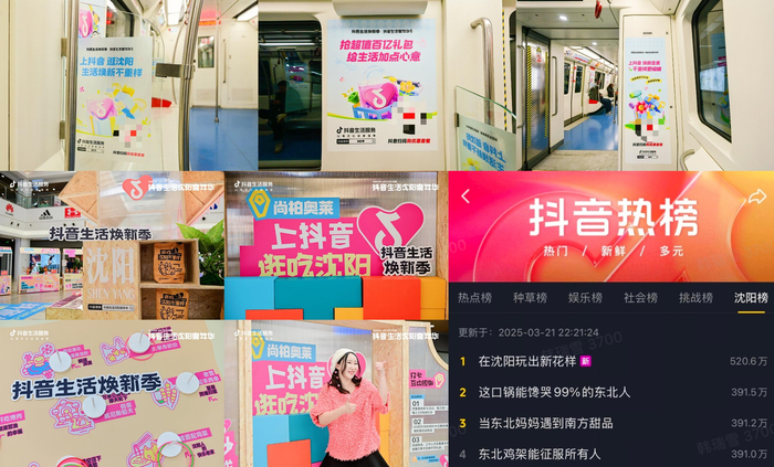 在抖音生活沈阳嘉年华、抖音生活青岛嘉年华的双城联动中,沈阳地铁1号线被改造成了"焕新包列",以工业历史为背景,融入现代消费元素。这种坐地铁=挖宝的玩法彻底带火了尚柏奥莱,通过站内广告位精准导流,让独家货盘和明星大场直播的GMV比平时翻了1.4倍。