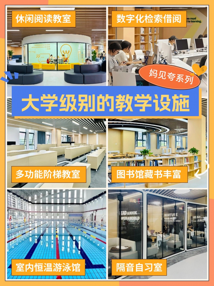老师非常耐心地带我们逛了一下学校,学校里的硬件设施真的很齐全!先说图书馆,不仅藏书多,桌椅摆放整齐,灯光也不刺眼,适合孩子安安静静看书学习。现在还用上了数字化检索阅览设备,孩子找书方便多了,轻轻一点就能查到想要的资料。学校还有健身房,各种健身器材都有,孩子课余时间能去锻炼锻炼身体;舞蹈房的镜子和地板都是专业配置,音乐设备也齐全,艺术班的孩子平时排练、练习可方便了。室内篮球场特别宽敞,下雨天也不耽误孩子们打球,尽情挥洒汗水。最让我惊喜的是室内恒温游泳馆,水质干净,水温也合适,孩子爱游泳的话,一年四季都能游,太贴心了。校园里还有个小花园,小路两边种着各种各样的花,还有假山和小池塘,坐旁边听着流水声,孩子学习累了来这儿逛逛,肯定能缓过劲儿来。实验室里设备看着都挺新,孩子做实验、探索新知识也方便。操场是塑胶跑道,篮球场、羽毛球场都有,孩子爱运动的话,课余时间也能尽情活动。学校还经常组织各种活动,像文化节、运动会、艺术展演这些,孩子们既能展示自己的特长,又能和同学老师增进感情。上次去参观的时候,正好碰上学校办文化节,孩子们自己布置摊位,展示手工艺品、书法绘画作品,特别热闹,感觉孩子在这儿上学能收获不少快乐和成长。