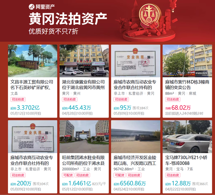 近日,湖北省黄冈市中级人民法院携手阿里资产平台,推出了一批优质法拍资产,快来挑选吧~
