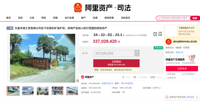 湖北省黄冈市中级人民法院将于2025年5月12日上午10时始至2025年5 月13日上午10时止(延时的除外)在阿里资产平台上对文昌丰源工贸有限公司名下石英砂矿采矿权、房地产及纳入执行范围的其他资产进行公开拍卖活动。