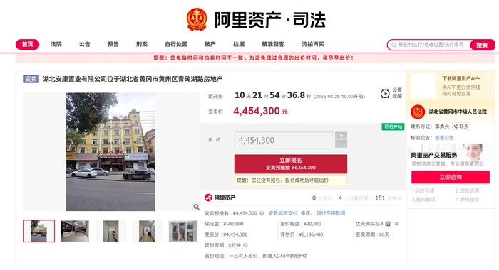 湖北省黄冈市中级人民法院将于2025年4月28日上午10时始至2025年6月27日上午10时止(延时的除外)在阿里资产平台上对湖北安康置业有限公司位于湖北省黄冈市黄州区青砖湖路房地产进行公开变卖活动。