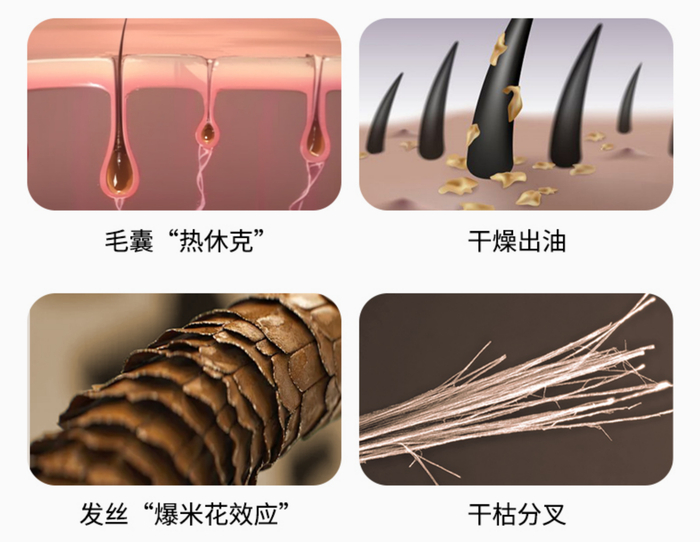 传统吹风机因温度控制粗放,长时间对着一个部位加热,易引起头皮屏障受损,造成毛囊“热休克”、新发难再生、头皮干燥代偿性出油等问题。持续的热暴露还可能造成发丝“爆米花效应”,使头发毛鳞片炸开,造成干枯分叉断发。年轻时头皮修复速度快,但随着年龄增大,毛囊损伤累积,变得难以修复。