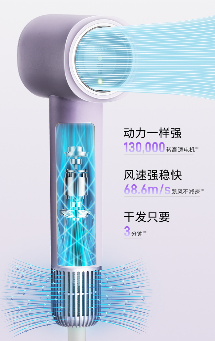 更小更强大,AI 迷你吹风机的核心性能依旧出众,搭载 37 亿高浓度水光等离子发射器[6],实现“内强韧外柔顺”的深度修护效果,进一步呵护受损发质,采用更稳定的等离子,即使热风也能维持护发效果。配合 13 万转/分钟三相高速无刷电机,风速高达 68.6 m/s[7],保证 3 分钟低温速干[8]。