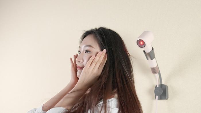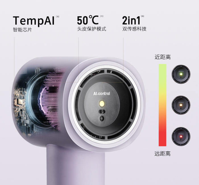 科西创新研发「AI 智能传感系统」,联合深圳智能传感协会共建实验室,通过高精度距离-温度双传感器与 AI 头皮屏障保护模型的协同作用,实现动态温控技术突破:当开启 AI 恒温模式,吹风机靠近头发时自动降温( 5-15 cm感应范围内),使触达头皮的风温保持 50℃ 避免热暴露。当吹风机远离头皮时,会自动升温维持在 50℃ 黄金阈值,既能快速干发,又可从源头规避热损伤风险,对敏感头皮和烫染受损发质更友好。