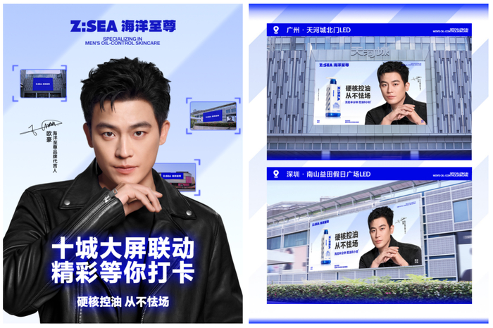官宣代言人后,海洋至尊还通过北京、上海等10城地标大屏广告、杭州核心商圈及美博会周边媒体覆盖,以及在小红书、抖音、微博等社交平台的持续加热,将欧豪的硬汉形象与“硬核控油从不怯场”的品牌心智深度融合,精准触达目标人群,全方位强化了品牌“男士控油护肤专家”的定位,更让控油从功能诉求升华为“自信掌控人生”的精神符号。