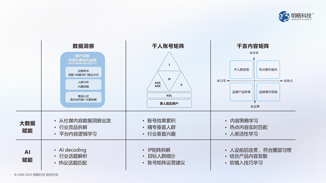 随着UGC内容逐步成为品牌资产的重要组成,如何系统化地获取、再构建UGC内容生态,拉爆现象级的热度,一直是品牌方面临的实操难题。在此背景下,明略科技正式推出新一代营销智能解决方案——DOMO多谋引擎。该解决方案秉持“让消费者的真声音成为品牌传播真流量”的核心使命,通过社媒数据洞察与AI大模型技术的双重驱动,搭建覆盖不同用户圈层的“千人矩阵”和动态生成内容策略的“千言矩阵”,实现UGC内容有效传播,破局实操困境。