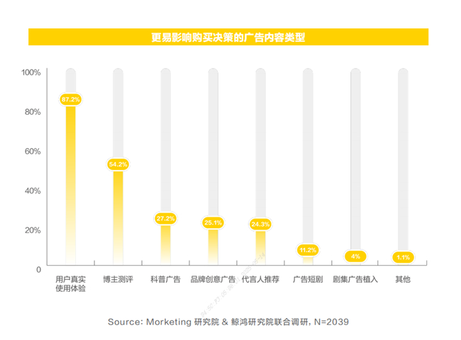 鲸鸿研究院联合MorketingResearch的调研显示,18-30岁新青年群体更看重“品牌真实性”而非“知名度”,超八成受访者因“用户真实体验”而产生购买行为。
