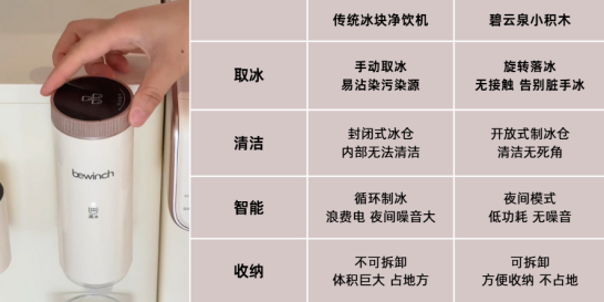 家庭用水需求的差异化正成为净水市场新趋势。数据显示,中国超七成消费者对家中水质存在担忧,且不同家庭成员的饮水偏好显著不同:年轻人热衷清凉冰饮,老年人偏爱热水养生,母婴群体则对水质安全有着极高要求。对于年轻一代来说,夏日畅饮冰水、制作创意冰饮成为生活刚需。碧云泉小积木的冰块模组搭载活水制冰功能,旋转落冰设计避免手触,产出的子弹头冰块清透厚实,彻底解决了冰箱冰块易串味、制冰慢的痛点。