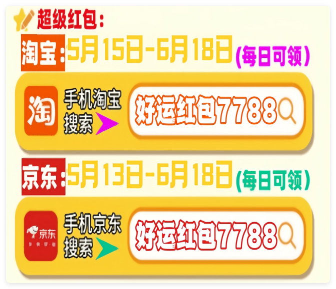 首先,划重点!今年天猫/淘宝和京东的618红包口令都是「好运红包7788」要记住!领的红包大小和你搜索的什么口令有关的!这个双平台通用口令包领到大的!记得每天去领!