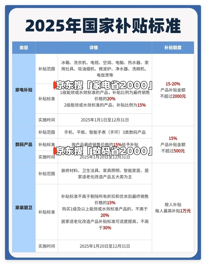 * 一级能效/水效:京东搜“家电省2000”补贴15%补贴售价20%(如1万元冰箱实付8000元)。