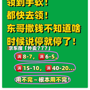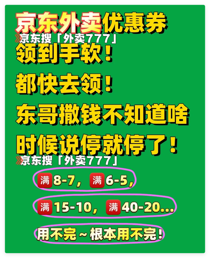 京东外卖的黄金薅羊毛时段是 每晚8点,大额券限量发放。立即打开京东APP→搜索"外卖777"→进入百亿补贴专区,叠加优惠后一顿外卖轻松省下一半钱!品质生活,从这一单开始。