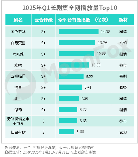从题材分类上看,2025年一季度的题材主要集中于都市、悬疑、剧情三大主流题材。在玄幻和农村题材上的发力超越去年各个季度,其中玄幻以优酷的《异人之下》、优酷与爱奇艺的联播剧《念无双》及爱奇艺的《白月梵星》三部S+为首,农村为多平台联播剧。