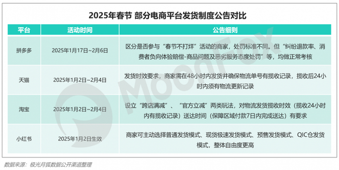 从发货政策来看,“保送达、不打烊”已成各家共识。其中,淘宝、天猫首当其冲对发货及送达时间给出了明确要求,违反后的处罚机制也较为明确;拼多多则围绕用户体验,围绕“纠纷退款率、负向体验赔偿”提出要求。2025年Q1,“仅退款”占到商家整体投诉问题比例的56%以上,我们认为,平台不可一味转嫁矛盾至买卖双方,结合4月各平台的相关政策,未来“仅退款”政策或将陆续取消,平台生态的长线优化和健康发展是电商行业当下变革的重点。