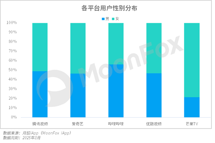 五大平台针对赛道具有流动、差异化的定位,所吸引的用户分类也不同。首先从用户性别分布数据来看,爱优腾三家的战略及定位较为一致且全面,对不同性别的吸引能力较平均。芒果TV以其自制综艺见长,其中多以情感、亲子、悬疑、音乐类综艺为主,对于女性吸引力较大。