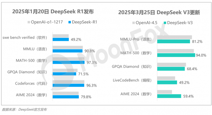 DeepSeek-R1版的发布,为2025年Q1全球AI产业的爆炸性话题。从性能上,R1正式追平OpenAI,开源、部署灵活、高性价比的特征使得R1迅速走红,2025年2月DeepSeek网站新增访问量超5.25亿次。3月,V3更新版发布,服务非复杂推理任务,用户可在关闭“深度思考”后使用,其推理、中文写作能力相较2024年底有显著提升,且在能力上全面超过OpenAI-4.5。