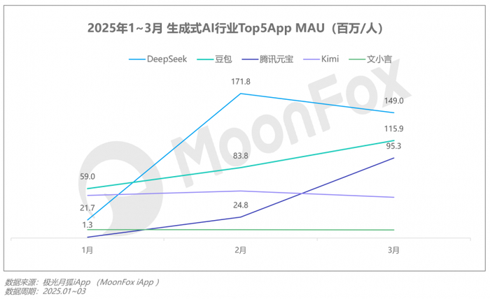 随着DeepSeek移动端的上线,其迅速成为了生成式AI赛道的Top1产品。据极光月狐数据,2025年2月,DeepSeek移动端MAU达1.71亿人次,超过豆包、腾讯元宝等成功登顶,虽在3月有所滑落,但用户使用热情不减,单日使用时长稳定在10分钟上下。