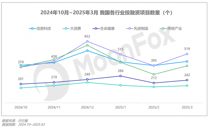 据行行查数据,2025年3月,我国投融资项目数量超过2,000个,整体数量稳定。从行业来看,先进制造、信息科技、传统产业仍为增长最为稳定且贡献项目数量最多的细分赛道,大消费、生命健康排名其后。关注行业中细分赛道表现,半导体、机器人、装备机械仍为先进制造行业中的Top3赛道,其中半导体相关投融资事件环比2024年底有所增加。