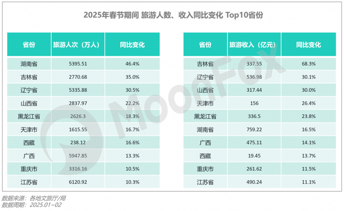 关注各地区春节期间的旅游数据表现。增幅维度下,冰雪旅游仍火热,带动了东北各省份旅游人次、收入的走高。以吉林为例,其在人次、收入维度同比增速分别排名第二、第一。一方面,春节期间吉林省各大滑雪场、冰雪旅游景区迎来客流高峰,长春冰雪新天地接待游客、营业收入分别同比增长89.8%、170.8%,优秀的滑雪场资源为吉林冰雪旅游带来优势。另一方面,吉林省围绕长白山、延边自治州等地区打造国际度假区和旅游热门地,如“松花江上·雪谷市集”接待游客29.4万人次,带动消费7,166万元。