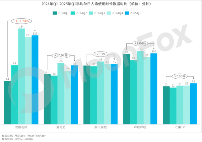 同时,从单日使用时长来看,在精品化内容战略下,各家均有所增长。其中,优酷的单日使用时长已连续三个季度保持行业第一优势,同比实现翻倍增长,稳坐时长榜第一位置。