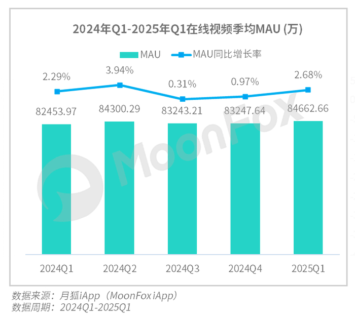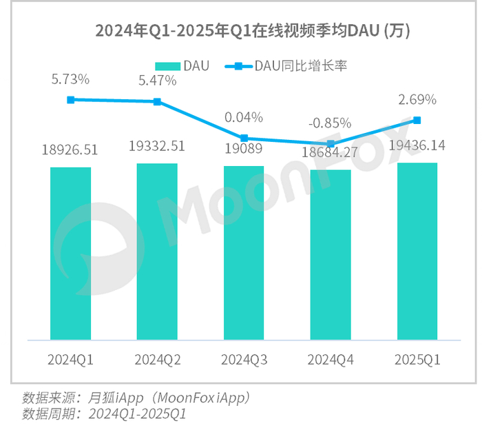 从月狐iApp数据来看,2025年第一季度,我国在线视频领域打破了过去两个季度的增速下滑态势,活跃用户规模整体呈上升趋势,季均DAU数据更是显眼,呈现出近两年来的巅峰状态。