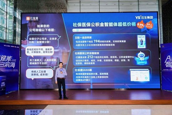 云生集团CTO吴斌现场公布了“社保医保公积金智能体”极具冲击力的售价:3000人以上企业费用低至0.99元/人/月!