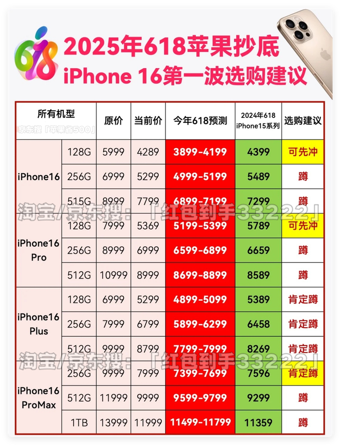 - 高潮期(6月16日-6月18日):全平台最低价时段,京东PLUS会员可叠加“满6000减600元”超级券,iPhone 16 Pro Max 256GB预计跌破7000元
