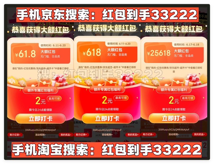 首先,划重点!今年天猫/淘宝和京东的618红包口令都是「红包到手33222」要记住!领的红包大小和你搜索的什么口令有关的!这个双平台通用口令包领到大的!记得每天去领!