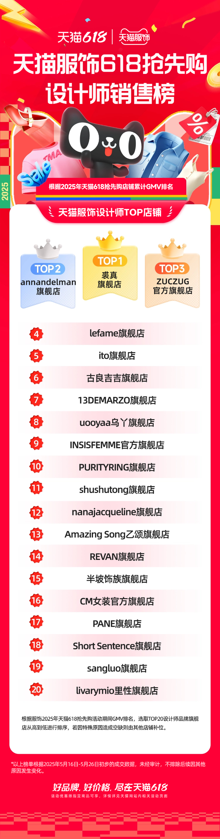 抢先购期间,专注做植鞣皮包的裘真、设计理念大胆前卫的annandelman、设计自然朴素的ZUCZUG,登上天猫服饰设计师销售榜TOP3。