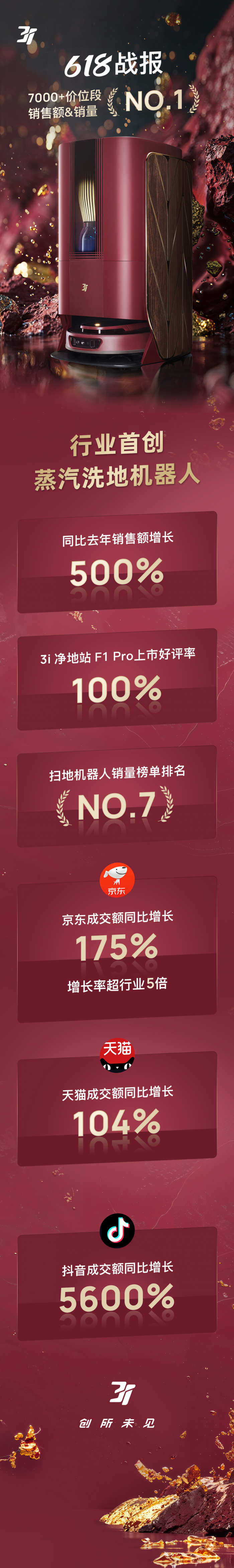 2025年扫地机器人市场内卷加剧,价格战白热化与同质化困局交织,而高端清洁赛道却因技术迭代与消费升级迸发新机遇,成为品牌破局的关键战场。今年618期间,3i旗下3i净地站F1 Pro强势突围,一举拿下 7000+价位段销售额与销量双料冠军,同比去年销售额狂飙 500%,重新定义高端扫地机器人的实力天花板!