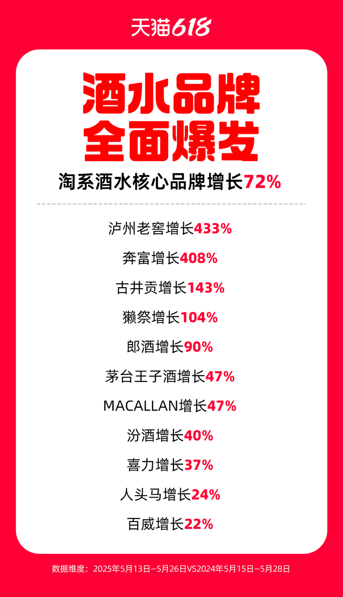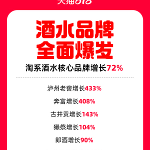 数据显示,5月13日到5月26日,天猫618第一阶段,淘系酒类核心品牌同比去年618第一阶段增长达到72%,其中,国产白酒、葡萄酒、黄酒均实现了双位数增长。