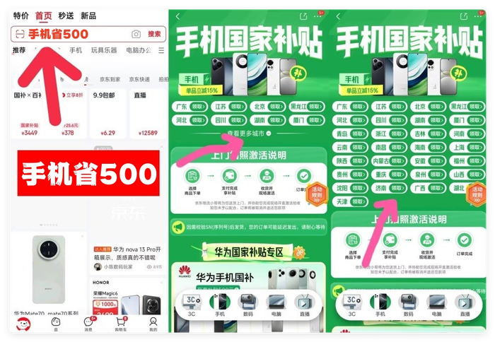补贴力度:京东搜“手机省500”按产品「最终成交价的15%」补贴,单台最高省500元(比如5000元的手机,补贴后最多省500元;3000元的平板,能省450元)。