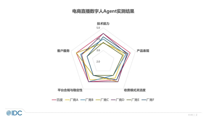 此外,随着国内电商直播规模突破万亿,电商直播数字人也呈现出蓬勃发展态势。百度慧播星提供AI数字人直播解决方案,通过助力客户实现0技术门槛、7×24小时全天候直播带货的革新式运营,已成为电商企业的增效利器。IDC最新发布的《中国AI Agent之电商直播数字人实测,2Q25》报告显示,百度慧播星综合实力排名行业第一。