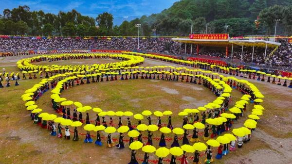 蓝天白云下,流动的黄伞,绽放的彩裙,灿烂而又鲜活。歌声起处,裙摆摇动,应和之声让人忍不住沉醉期间!这,就是彝族“朵乐荷”的神秘魅力!
