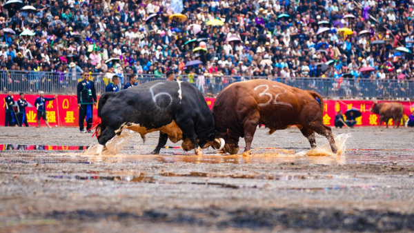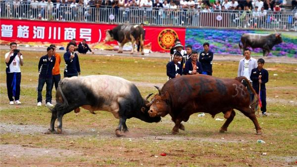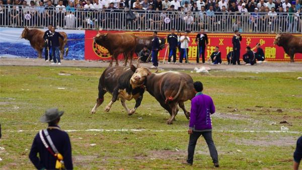 它们会使用扑、闪、撞、让等技能和劲敌抗衡,斗败一头,另一头又冲上来,战至最后者便是当之无愧的牛王。