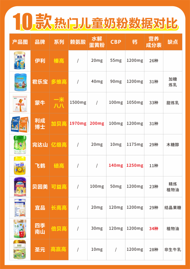 本次测评涵盖伊利QQ星榛高、完达山亿级高、利成博士加贝高、君乐宝多维高、飞鹤碚高、蒙牛一米八八、贝因美可益高、宜品长高高、四季南山倍贝高、圣元高赢高共10款热销产品,从核心成分含量、营养覆盖广度、配方针对性等多维度进行对比分析。