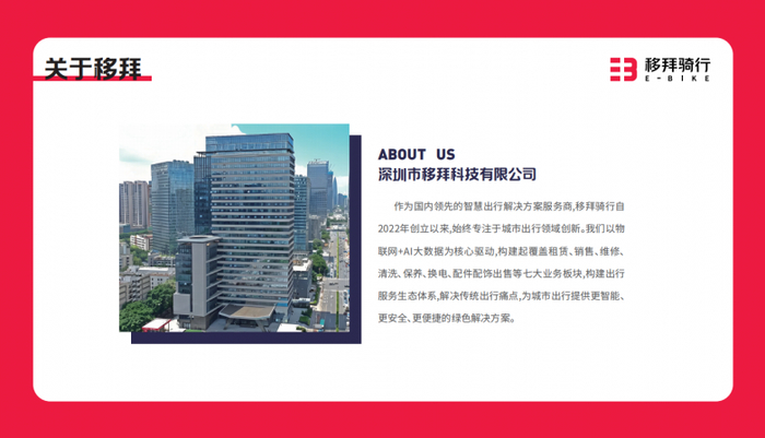移拜骑行,不仅是出行方式的选择,更是对未来城市生活的一种期待。诚邀更多合作伙伴、行业同仁与用户,一起驶入绿色出行新纪元,共创智慧城市新生态。