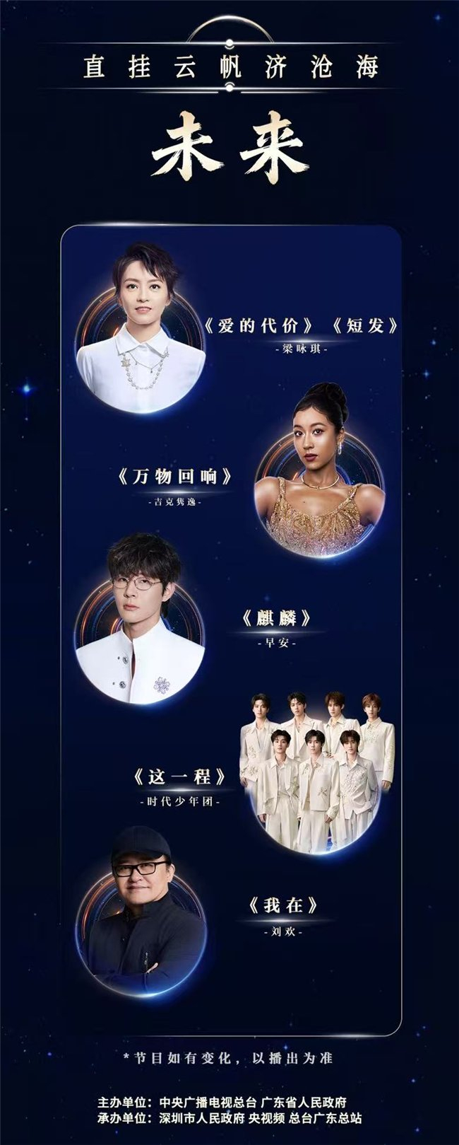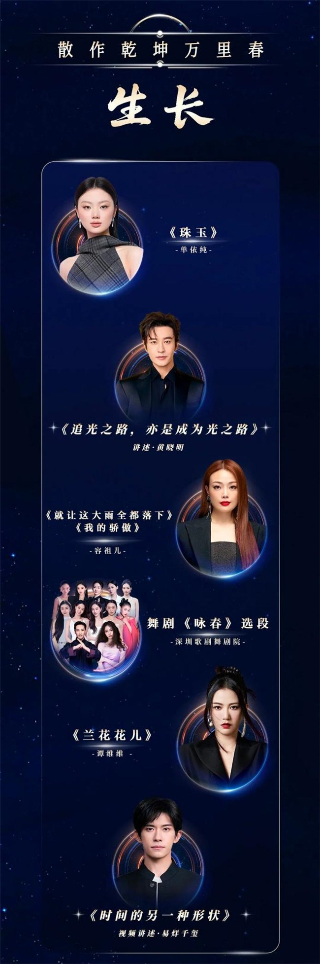 节目以“突破、生长、信念与未来”为叙事主线,通过四大篇章层层推进。撒贝宁、谢娜、黄晓明、王冰冰联袂主持,刘欢、黄渤、孙楠、梁咏琪、容祖儿、萧敬腾、谭维维、易烊千玺、时代少年团、单依纯、任嘉伦、吉克隽逸、姚安娜、李斯丹妮、王霏霏、孟佳、Grace Kinstler、回春丹、SHarK米尔艾力、早安、郜一霏、深圳歌剧舞剧院舞剧《咏春》选段等,以“追光人”的身份一同唱响“我们”。